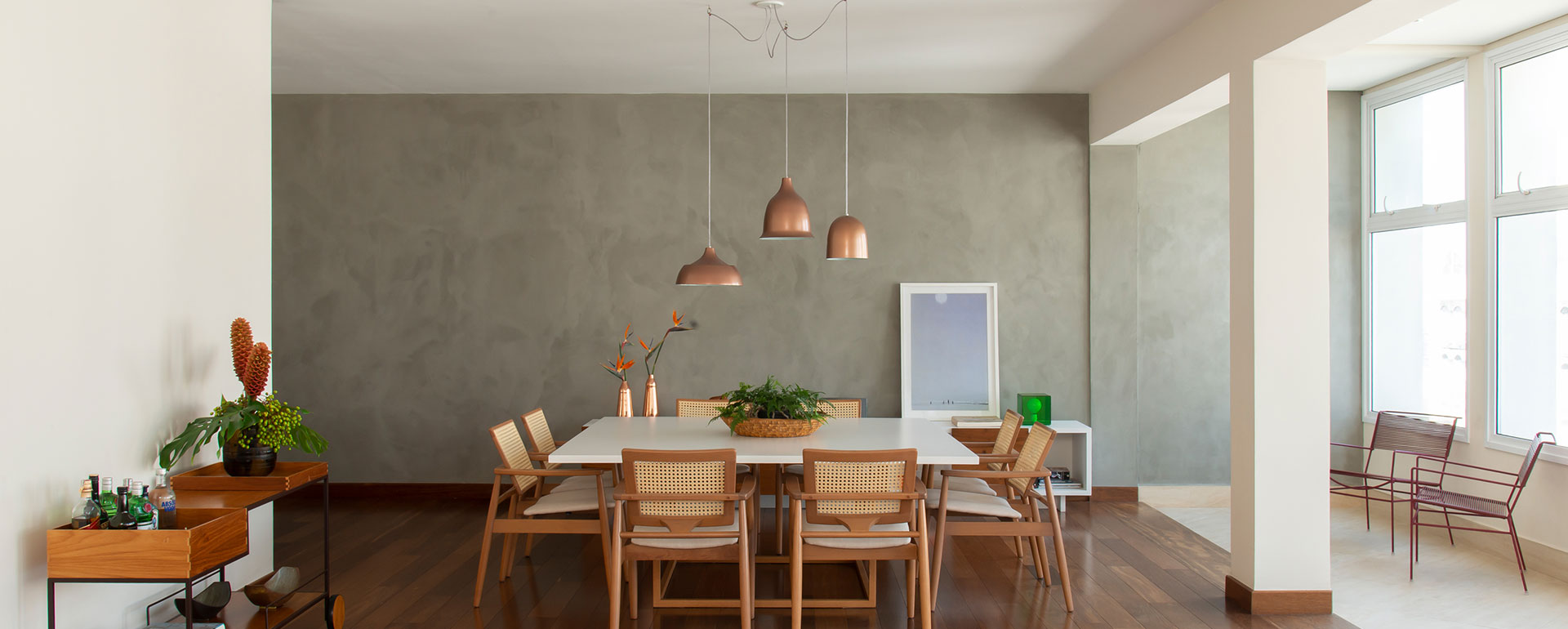 Um apartamento alugado pede poucas interferências, ainda mais neste caso, em que havia a possibilidade de um futuro retorno do proprietário após alguns anos. De qualquer maneira, o apartamento precisava da manutenção do forro de gesso e de uma pintura geral, que assumimos para o proprietário e o locatário. Como alteração efetiva, sugerimos a parede de cimento queimado na sala, para quebrar a regularidade das paredes monocromáticas. Após ver o resultado, até o proprietário decidiu mantê-la definitivamente. Outras alterações foram apenas em cor de parede e disposição de mobiliário e acessórios. Alguns comprados, outros desenhados pelo escritório, como as prateleiras de um dos quartos de bebê, o buffet da Sala de Jantar e a mesa lateral da Sala de Estar, chamada Mesa Equilíbrio. Os toques finais foram dados pelas cortinas, colchas, almofadas e quadros, com distribuição pensada para valorizar as paredes e os ambientes.